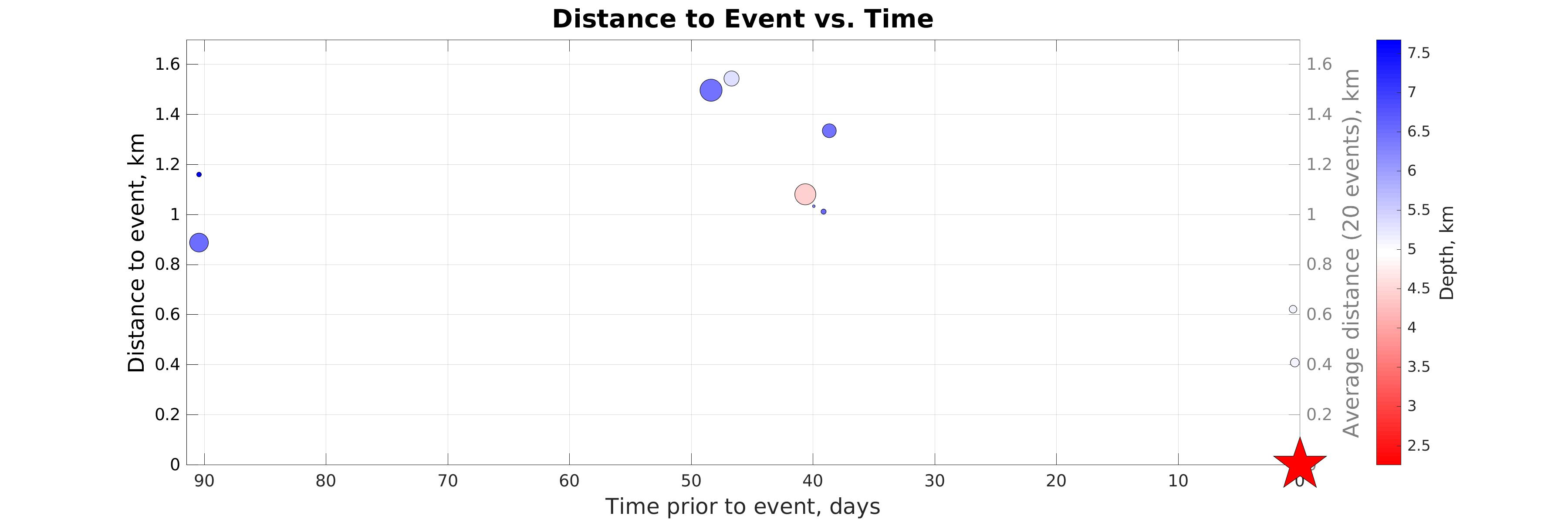 Distance (left axis) vs. time of earthquakes in the seismicity map prior to the event considered (star). Color represents hypocentral depth (see colorbar). The gray line shows distance to event considered averaged within sliding time window of 20 events.
