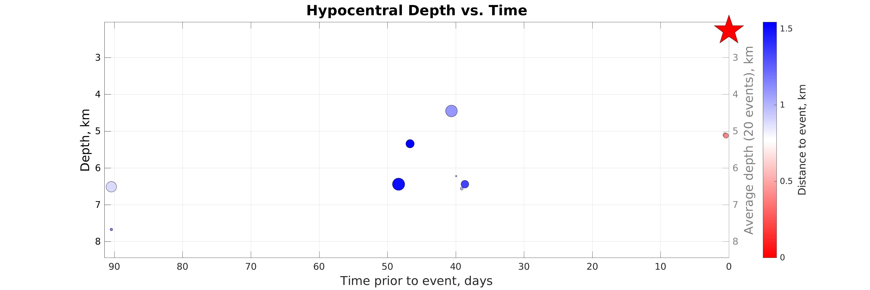 Hypocentral depth (left axis) vs. time of earthquakes in the seismicity map prior to the event considered (star). Color represents distance to the event considered (see colorbar). The gray line shows the depth averaged within sliding time window of 20 events.