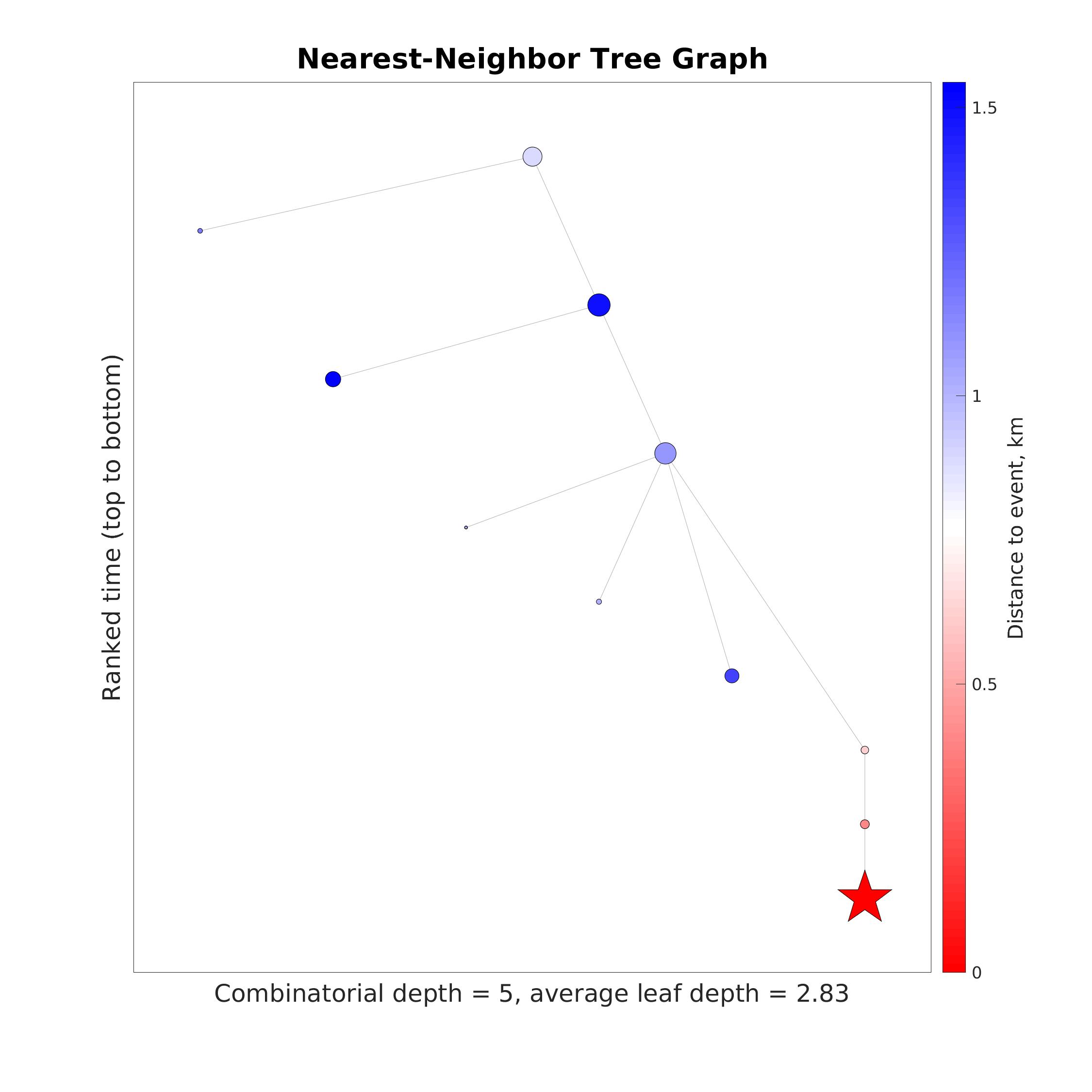 Tree graph representing nearest-neighbor connections (gray lines) among the earthquakes in the seismicity map prior to the event considered (star). Y-axis represents ranked time (from top to bottom). X-coordinates of events are calculated for proper visual embedding of the tree in the plane and do not represent a physical characteristic. Color represents distance to the event considered (see colorbar). The combinatorial depth of the tree (number of generations) and the average leaf depth are marked. The results are based on the methodology of Zaliapin and Ben-Zion (2013).