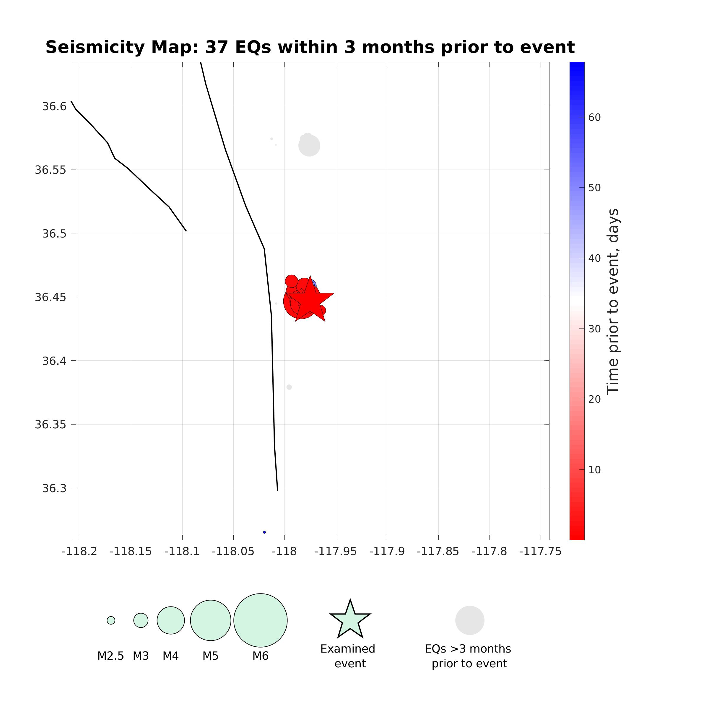 Map view of earthquakes (circles) with magnitude M2.0+ that occurred within 3 months and within 5 rupture lengths from the event considered (star). Circle size is proportional to magnitude (see legend) and color represents the time prior to the event considered (see colorbar).