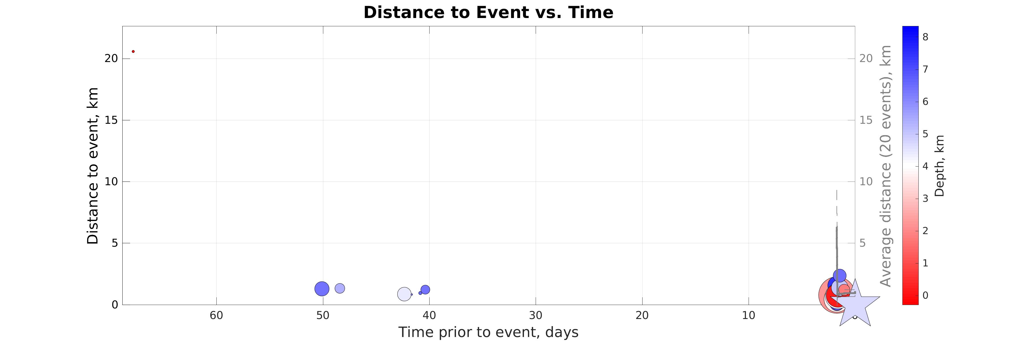 Distance (left axis) vs. time of earthquakes in the seismicity map prior to the event considered (star). Color represents hypocentral depth (see colorbar). The gray line shows distance to event considered averaged within sliding time window of 20 events.