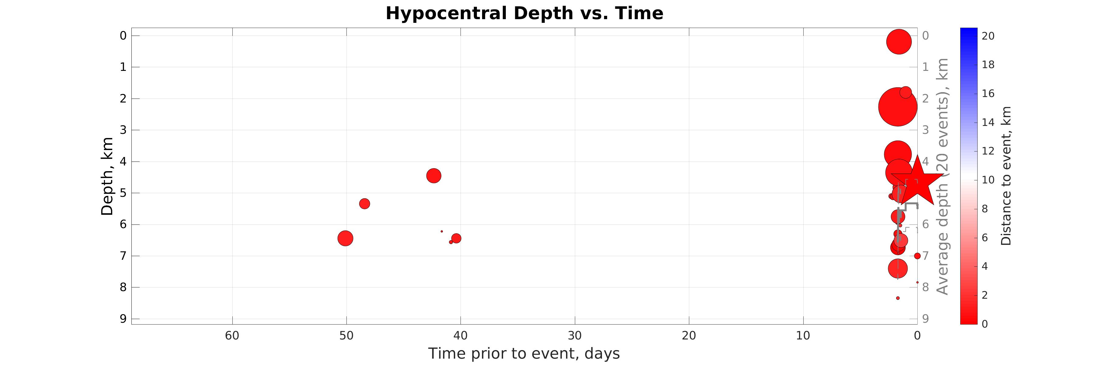 Hypocentral depth (left axis) vs. time of earthquakes in the seismicity map prior to the event considered (star). Color represents distance to the event considered (see colorbar). The gray line shows the depth averaged within sliding time window of 20 events.