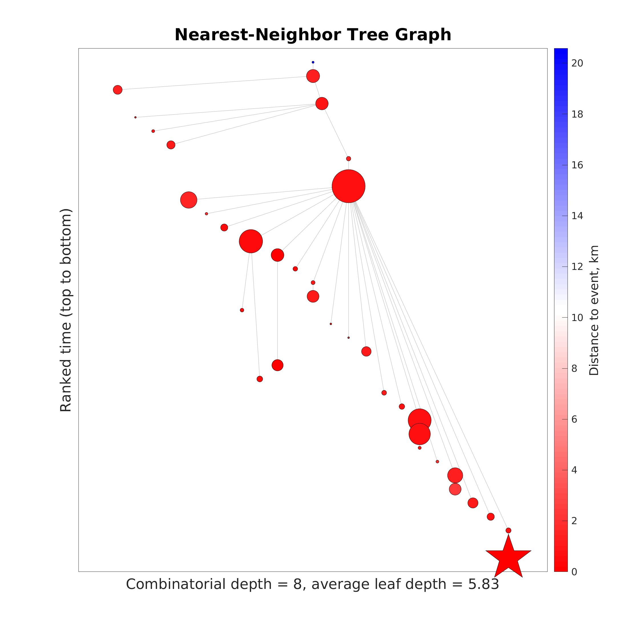 Tree graph representing nearest-neighbor connections (gray lines) among the earthquakes in the seismicity map prior to the event considered (star). Y-axis represents ranked time (from top to bottom). X-coordinates of events are calculated for proper visual embedding of the tree in the plane and do not represent a physical characteristic. Color represents distance to the event considered (see colorbar). The combinatorial depth of the tree (number of generations) and the average leaf depth are marked. The results are based on the methodology of Zaliapin and Ben-Zion (2013).