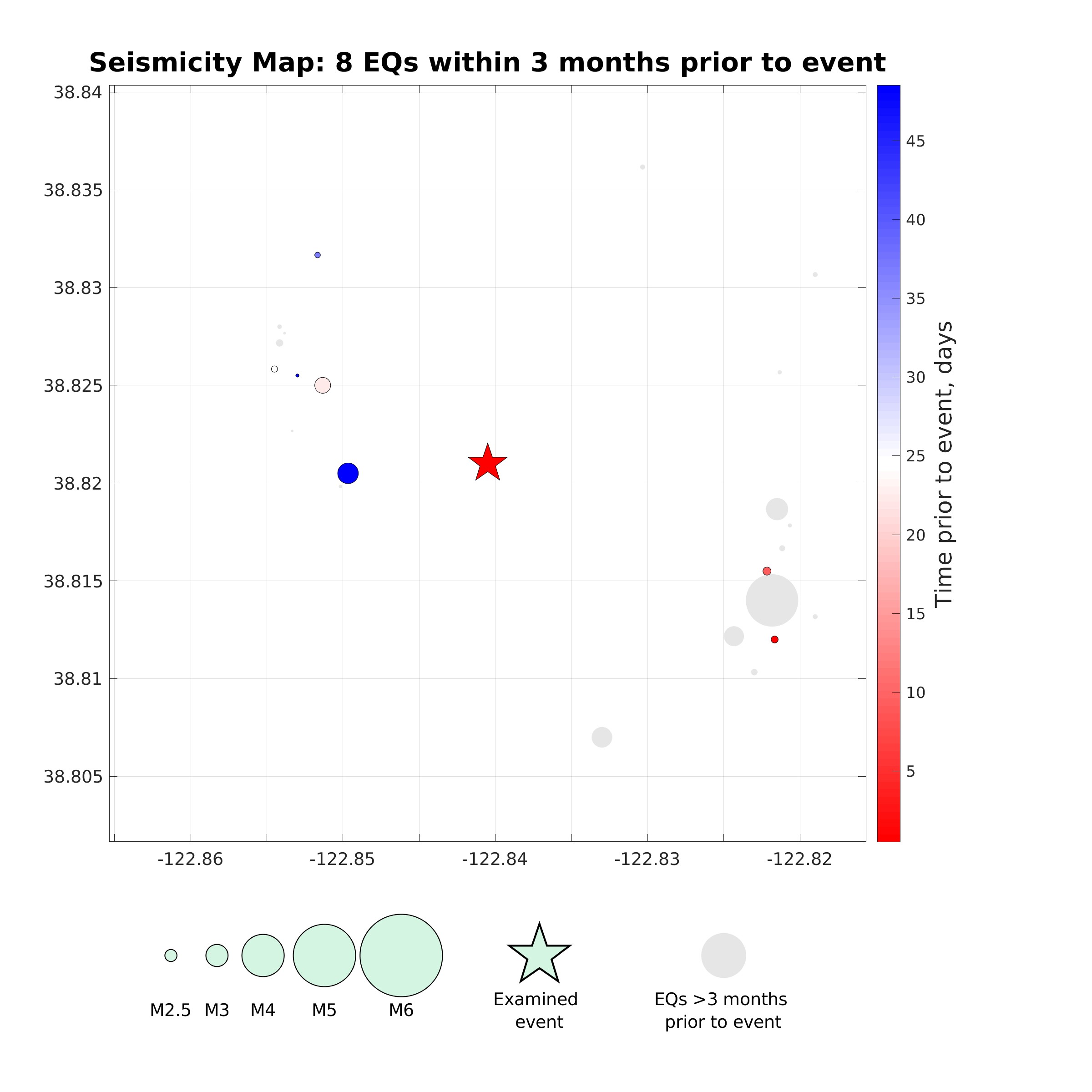This plot shows the magnitude vs. time evolution of the sequence. The mainshock is ploted as a brown circle, foreshocks are plotted as magenta circles, and aftershocks are plotted as cyan circles.