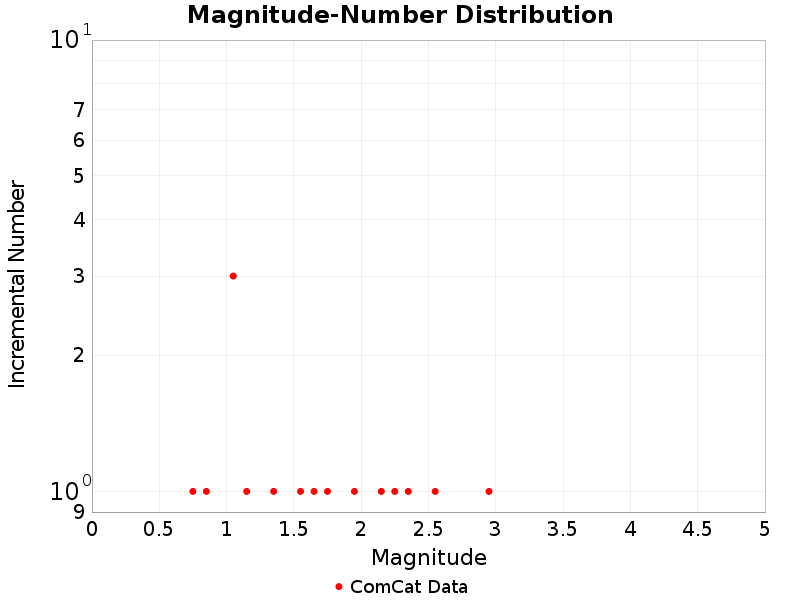 These plot shows the magnitude-number distribution of the aftershock sequence thus far. The left plot gives an incremental distribution (the count in each magnitude bin), and the right plot a cumulative distribution (the count in or above each magnitude bin).