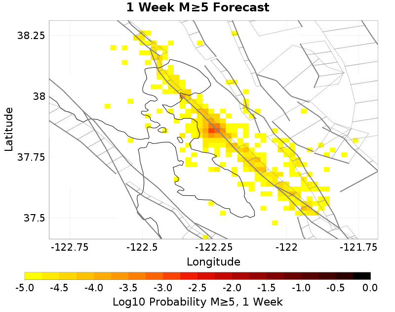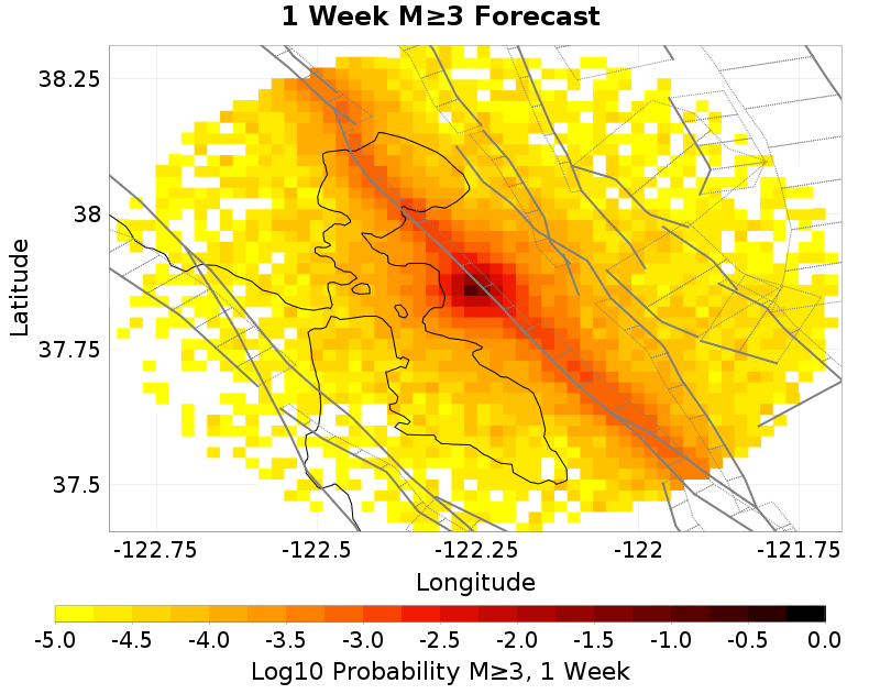 This table gives forecasted one week and one month probabilities for events triggered by this sequence; it does not include the long-term probability of such events.