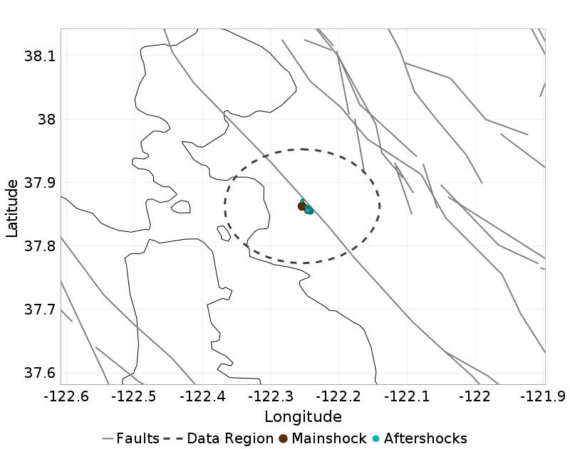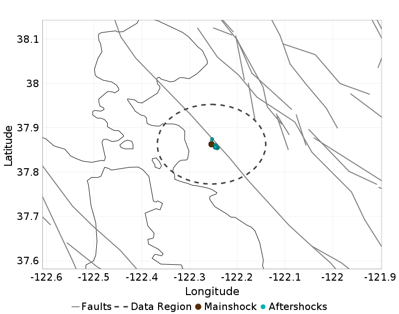 Map view of the aftershock sequence, plotted as cyan circles. The mainshock  is plotted below as a brown circle, but may be obscured by aftershocks. Nearby UCERF3 fault traces are plotted in gray lines, and the region used to fetch aftershock data in a dashed dark gray line.