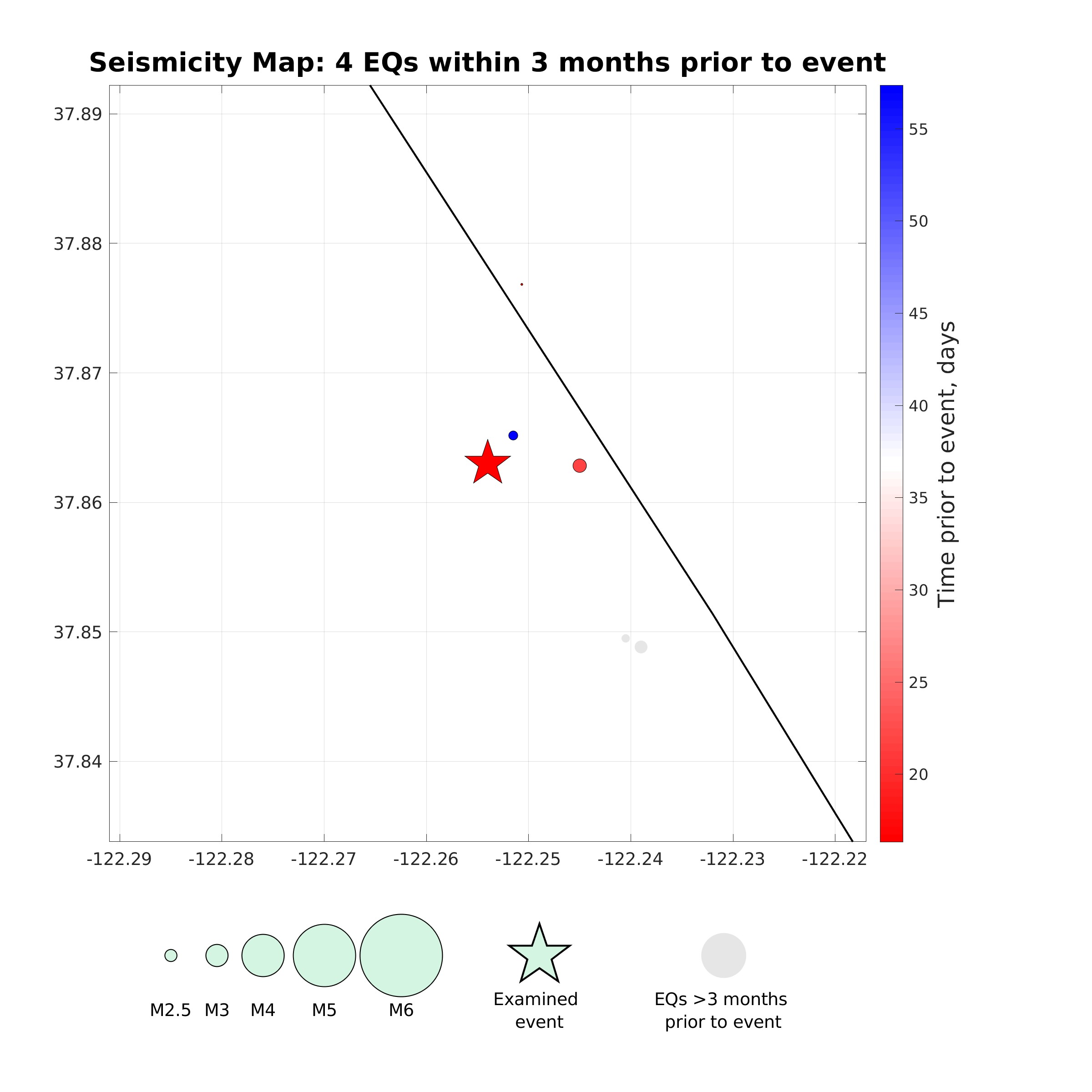 Map view of earthquakes (circles) with magnitude M2.0+ that occurred within 3 months and within 5 rupture lengths from the event considered (star). Circle size is proportional to magnitude (see legend) and color represents the time prior to the event considered (see colorbar).