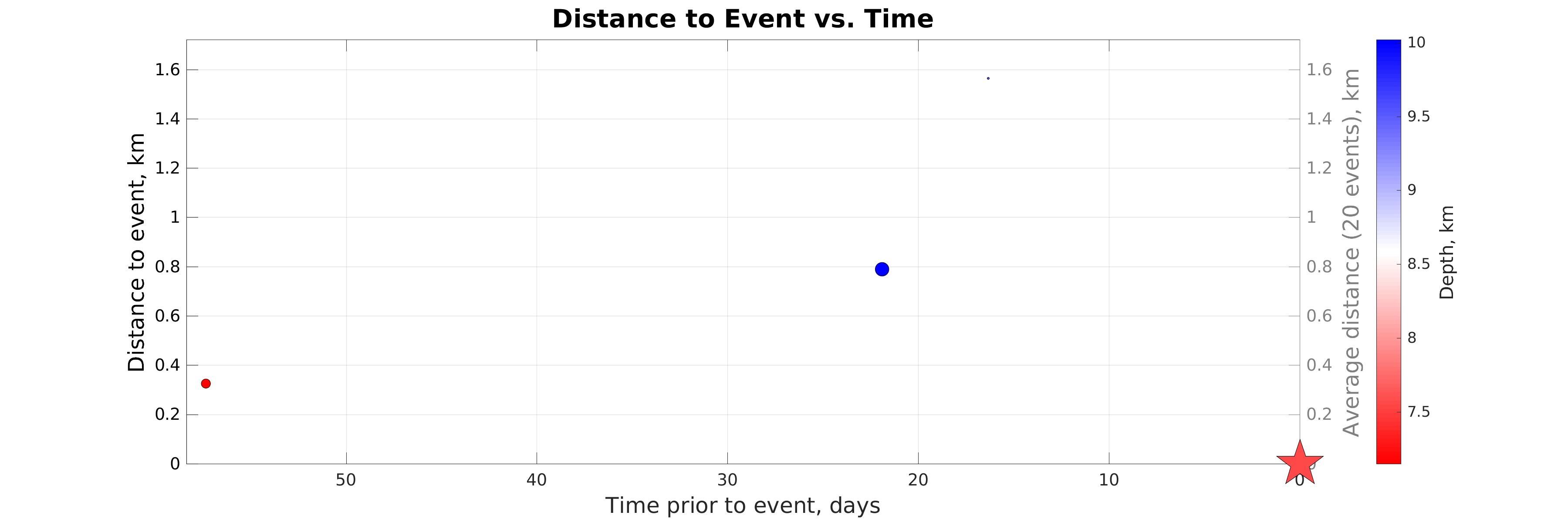 Distance (left axis) vs. time of earthquakes in the seismicity map prior to the event considered (star). Color represents hypocentral depth (see colorbar). The gray line shows distance to event considered averaged within sliding time window of 20 events.