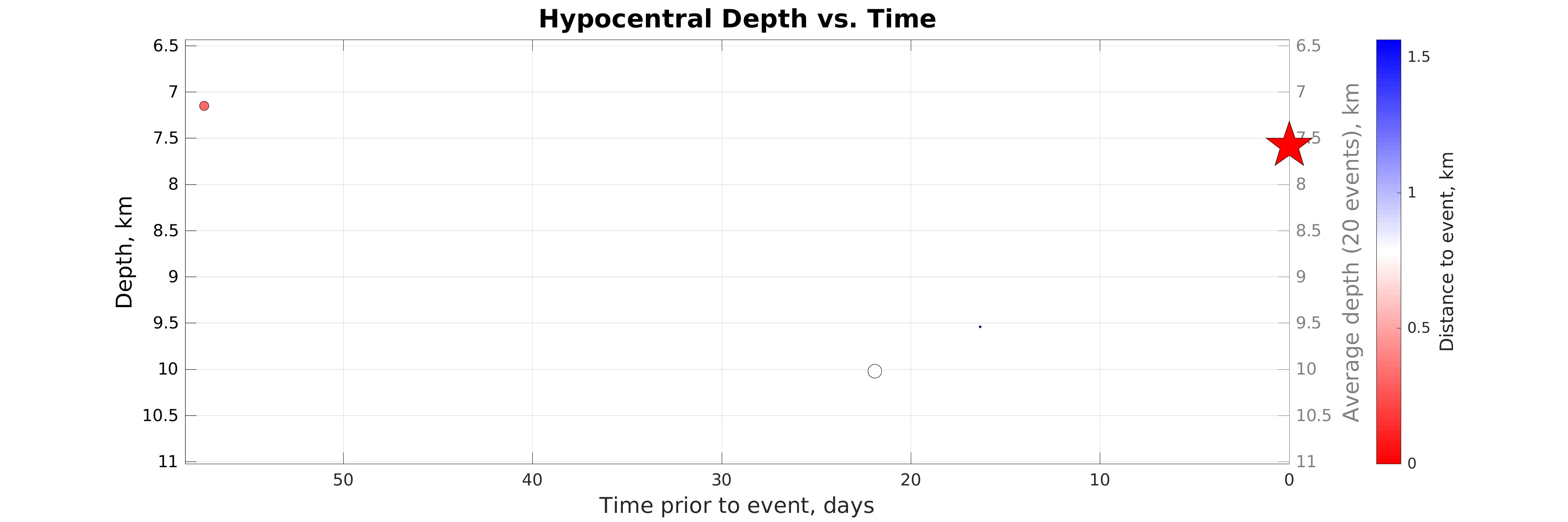Hypocentral depth (left axis) vs. time of earthquakes in the seismicity map prior to the event considered (star). Color represents distance to the event considered (see colorbar). The gray line shows the depth averaged within sliding time window of 20 events.