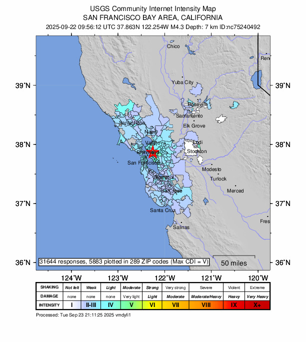 Probabilities are inherantly time-dependent. Those stated here are for time periods beginning the instant when this report was generated, 2025/09/22 13:59:10 CDT. The model has not been updated with any observed aftershocks and may be out of date, especially if large aftershock have occurred subsequently or a significant amount of time has passed since the mainshock.