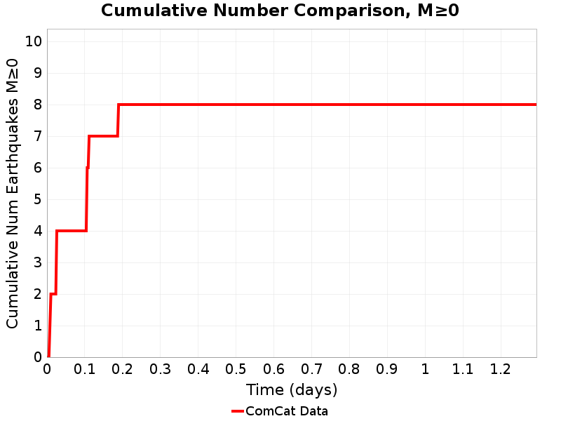 This plot shows the cumulative number of M≥0 aftershocks as a function of time since the mainshock.