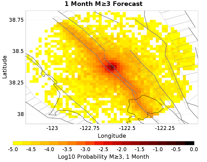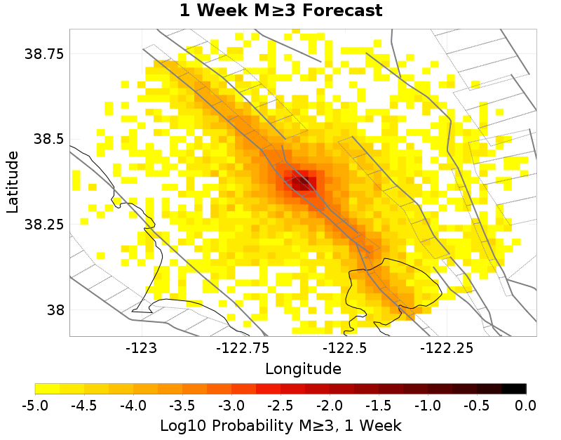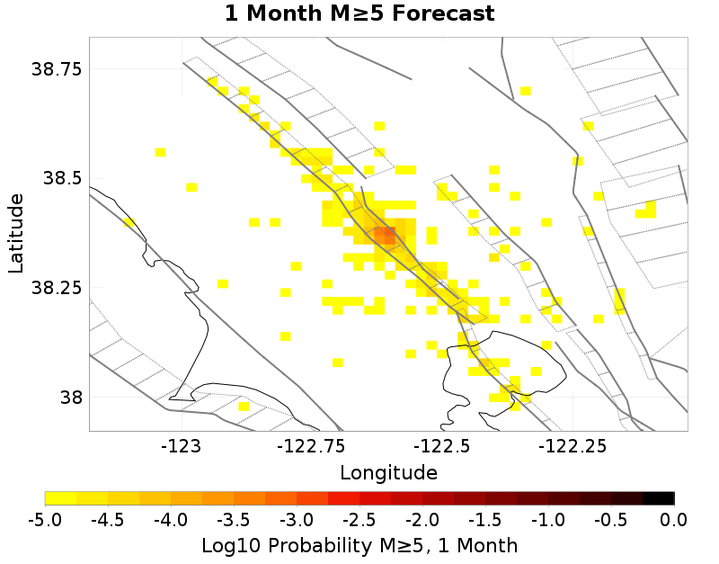 This table gives forecasted one week and one month probabilities for events triggered by this sequence; it does not include the long-term probability of such events.
