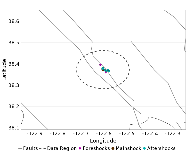 Map view of the aftershock sequence, plotted as cyan circles. The mainshock and foreshocks are plotted below in brown and magenta circles respectively, but may be obscured by aftershocks. Nearby UCERF3 fault traces are plotted in gray lines, and the region used to fetch aftershock data in a dashed dark gray line.