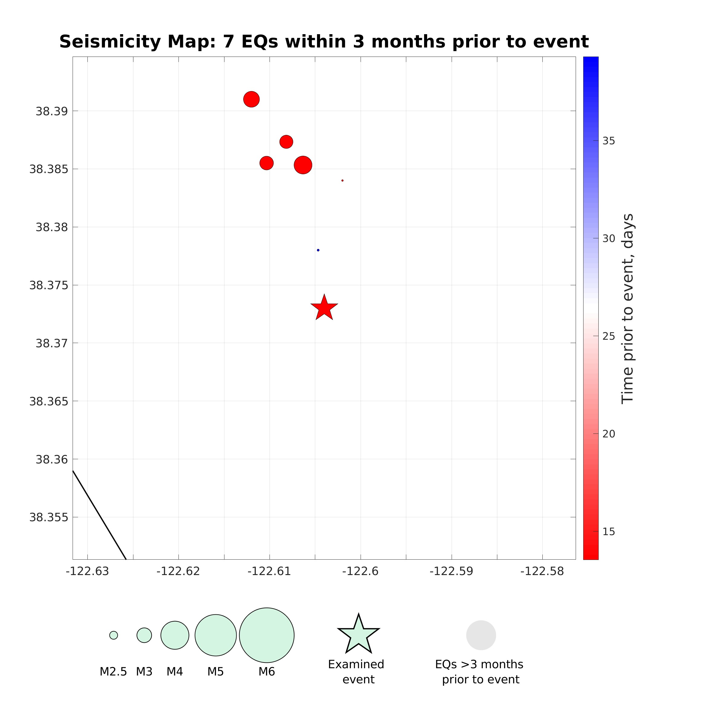 Map view of earthquakes (circles) with magnitude M2.0+ that occurred within 3 months and within 5 rupture lengths from the event considered (star). Circle size is proportional to magnitude (see legend) and color represents the time prior to the event considered (see colorbar).