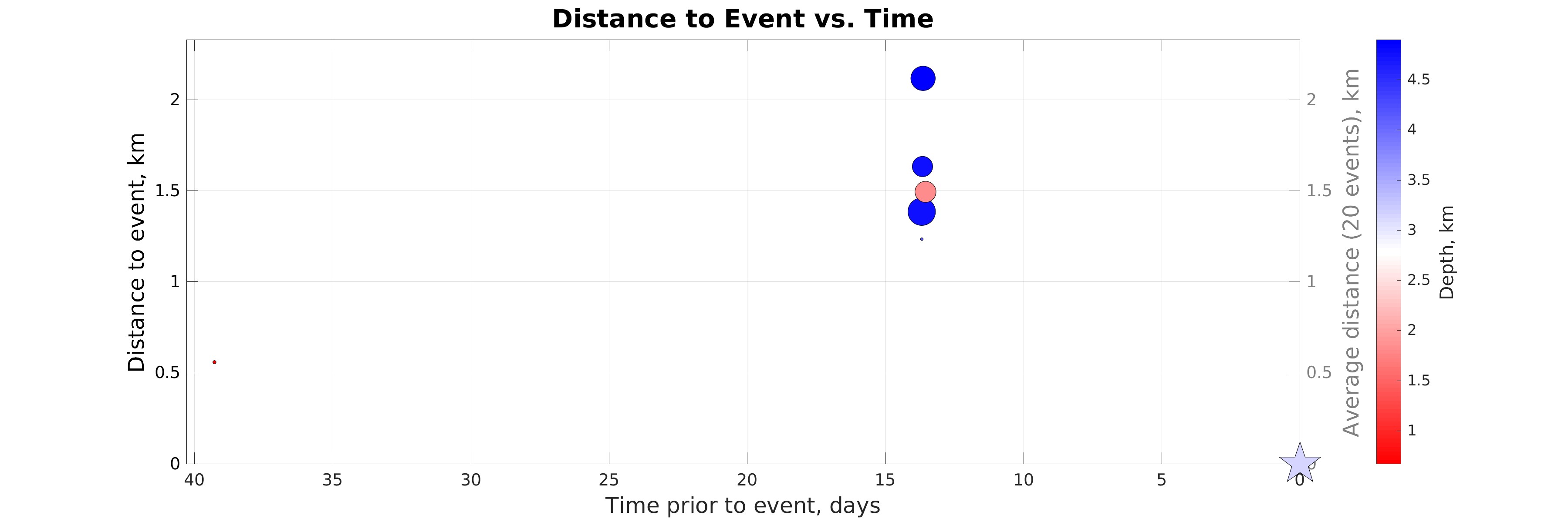 Distance (left axis) vs. time of earthquakes in the seismicity map prior to the event considered (star). Color represents hypocentral depth (see colorbar). The gray line shows distance to event considered averaged within sliding time window of 20 events.