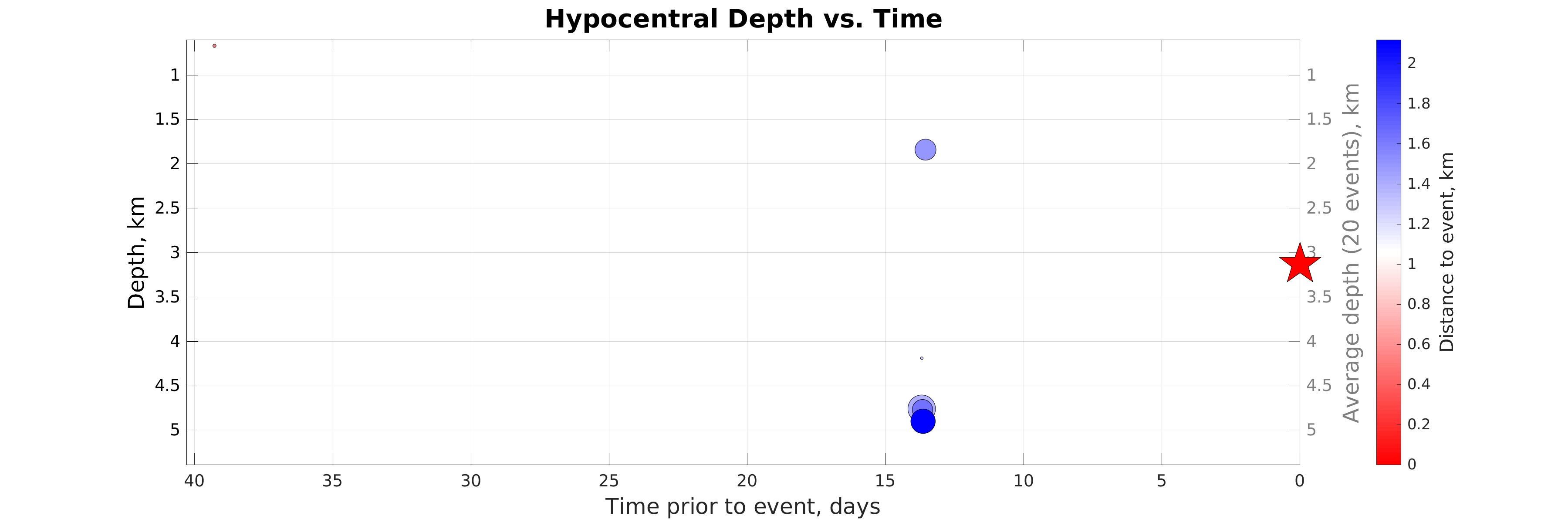 Hypocentral depth (left axis) vs. time of earthquakes in the seismicity map prior to the event considered (star). Color represents distance to the event considered (see colorbar). The gray line shows the depth averaged within sliding time window of 20 events.