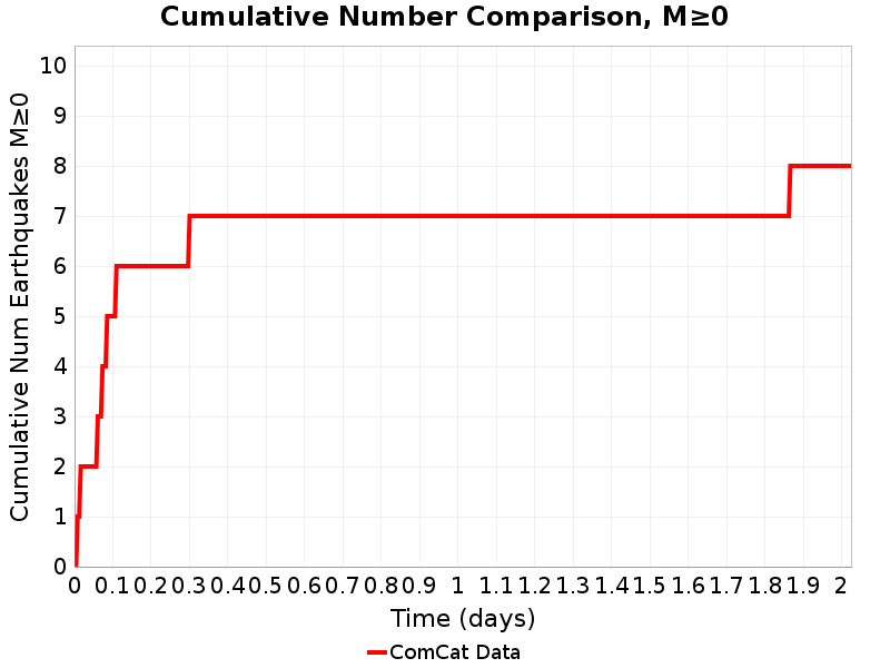 This plot shows the cumulative number of M≥0 aftershocks as a function of time since the mainshock.