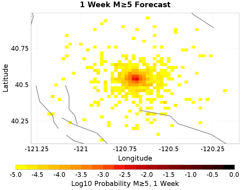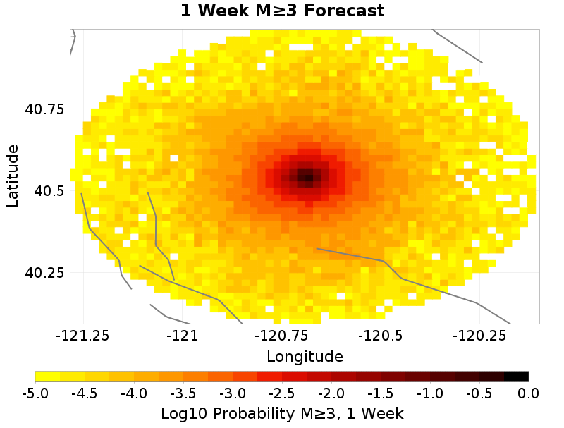 This table gives forecasted one week and one month probabilities for events triggered by this sequence; it does not include the long-term probability of such events.