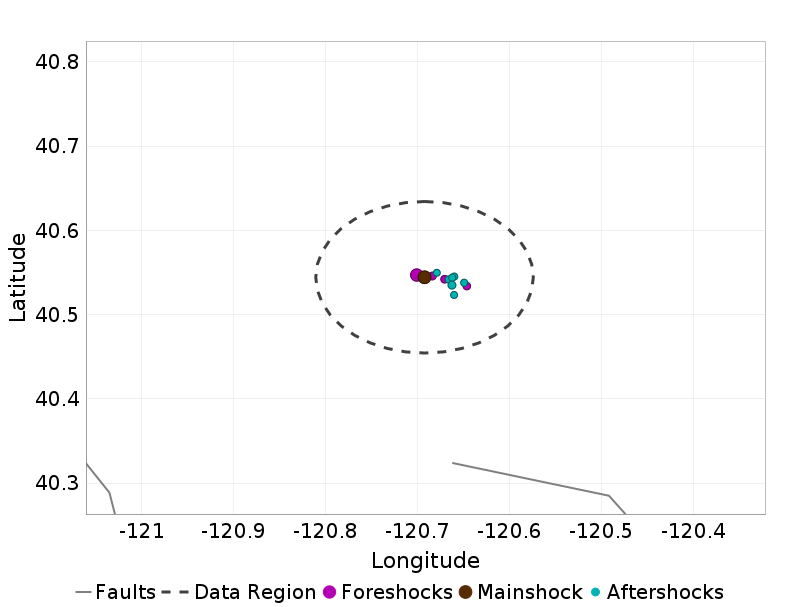 Map view of the aftershock sequence, plotted as cyan circles. The mainshock and foreshocks are plotted below in brown and magenta circles respectively, but may be obscured by aftershocks. Nearby UCERF3 fault traces are plotted in gray lines, and the region used to fetch aftershock data in a dashed dark gray line.