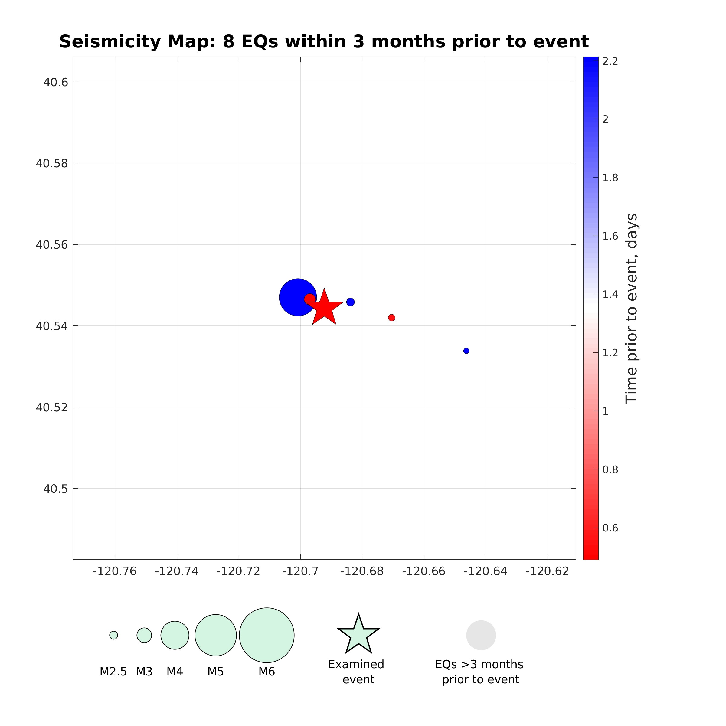 Map view of earthquakes (circles) with magnitude M2.0+ that occurred within 3 months and within 5 rupture lengths from the event considered (star). Circle size is proportional to magnitude (see legend) and color represents the time prior to the event considered (see colorbar).