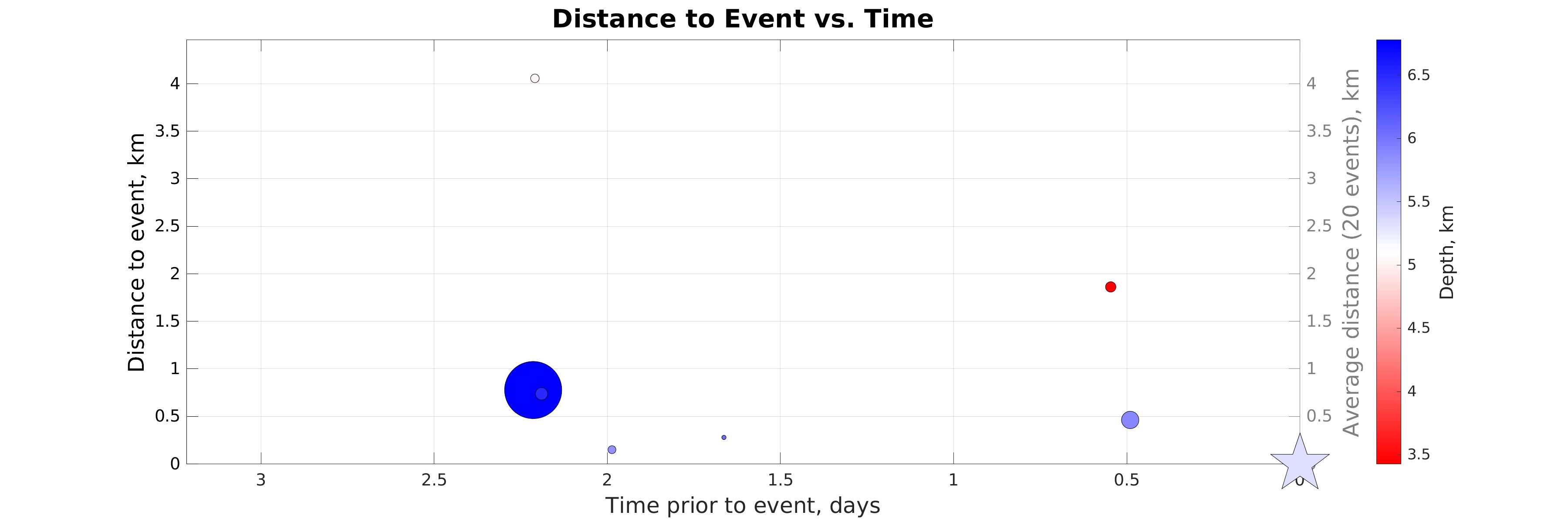 Distance (left axis) vs. time of earthquakes in the seismicity map prior to the event considered (star). Color represents hypocentral depth (see colorbar). The gray line shows distance to event considered averaged within sliding time window of 20 events.