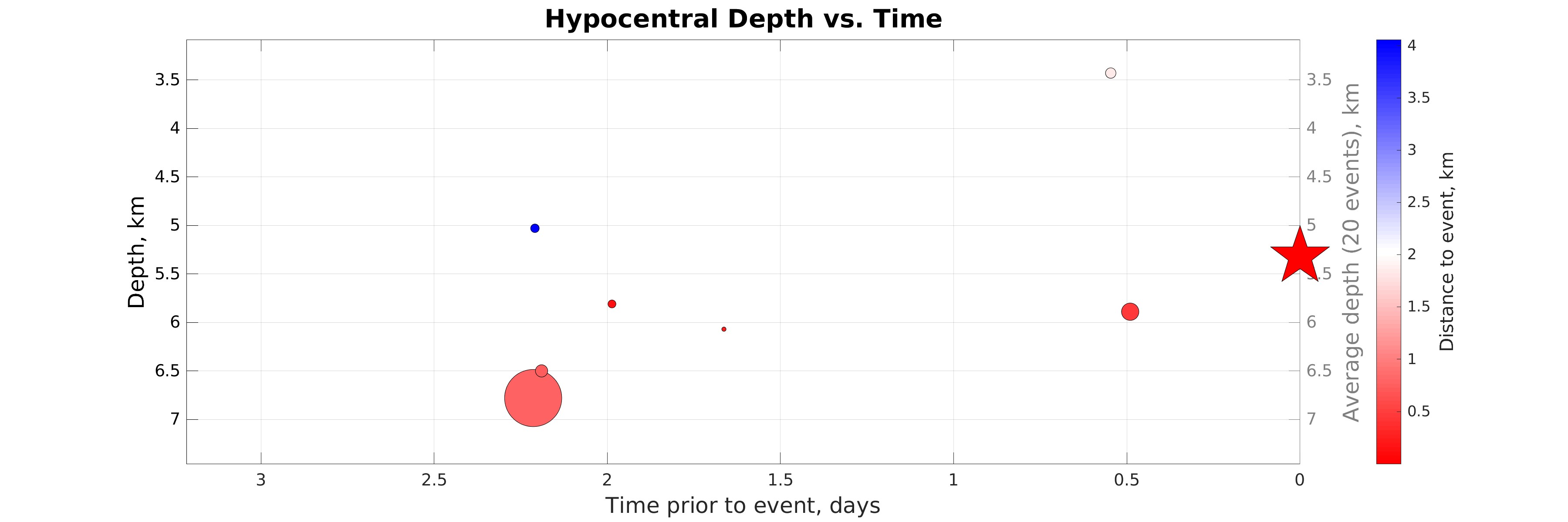 Hypocentral depth (left axis) vs. time of earthquakes in the seismicity map prior to the event considered (star). Color represents distance to the event considered (see colorbar). The gray line shows the depth averaged within sliding time window of 20 events.