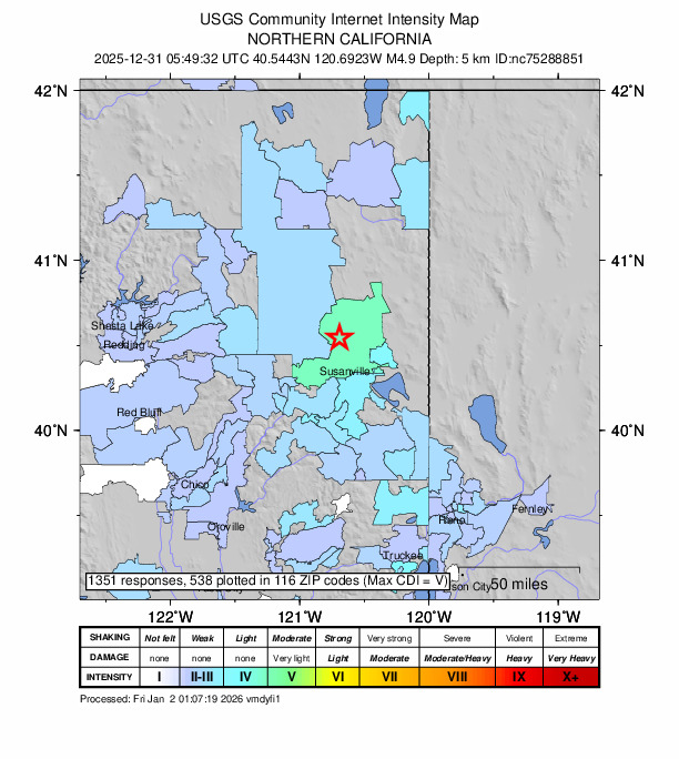 Probabilities are inherantly time-dependent. Those stated here are for time periods beginning the instant when this report was generated, 2025/12/31 10:47:12 CST. The model has not been updated with any observed aftershocks and may be out of date, especially if large aftershock have occurred subsequently or a significant amount of time has passed since the mainshock.