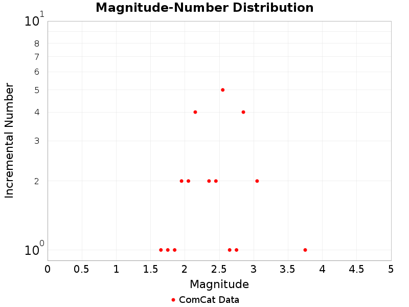 These plot shows the magnitude-number distribution of the aftershock sequence thus far. The left plot gives an incremental distribution (the count in each magnitude bin), and the right plot a cumulative distribution (the count in or above each magnitude bin).