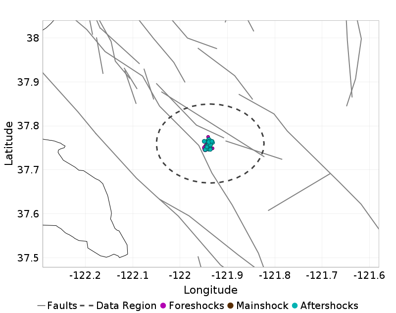 Map view of the aftershock sequence, plotted as cyan circles. The mainshock and foreshocks are plotted below in brown and magenta circles respectively, but may be obscured by aftershocks. Nearby UCERF3 fault traces are plotted in gray lines, and the region used to fetch aftershock data in a dashed dark gray line.