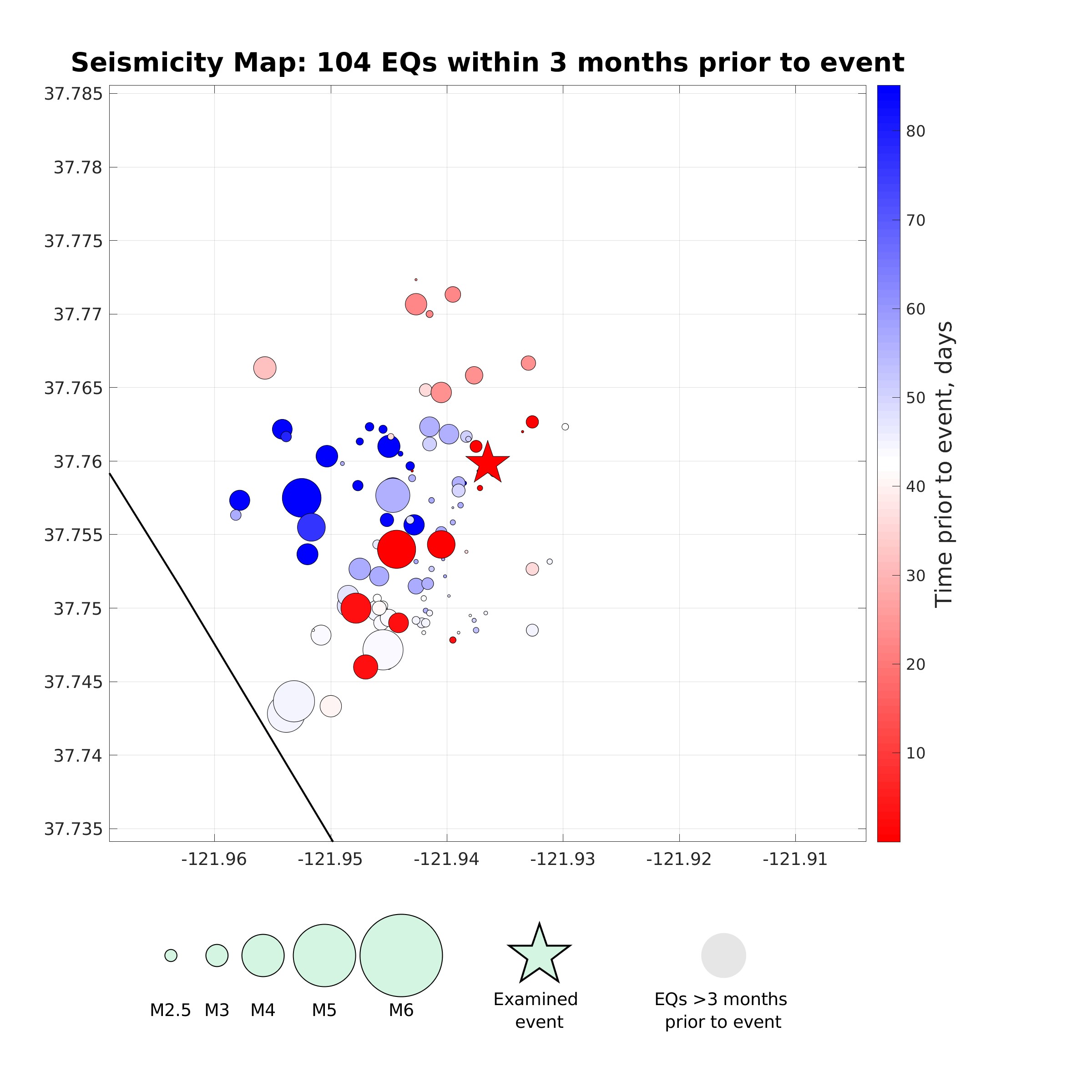 This plot shows the magnitude vs. time evolution of the sequence. The mainshock is ploted as a brown circle, foreshocks are plotted as magenta circles, and aftershocks are plotted as cyan circles.