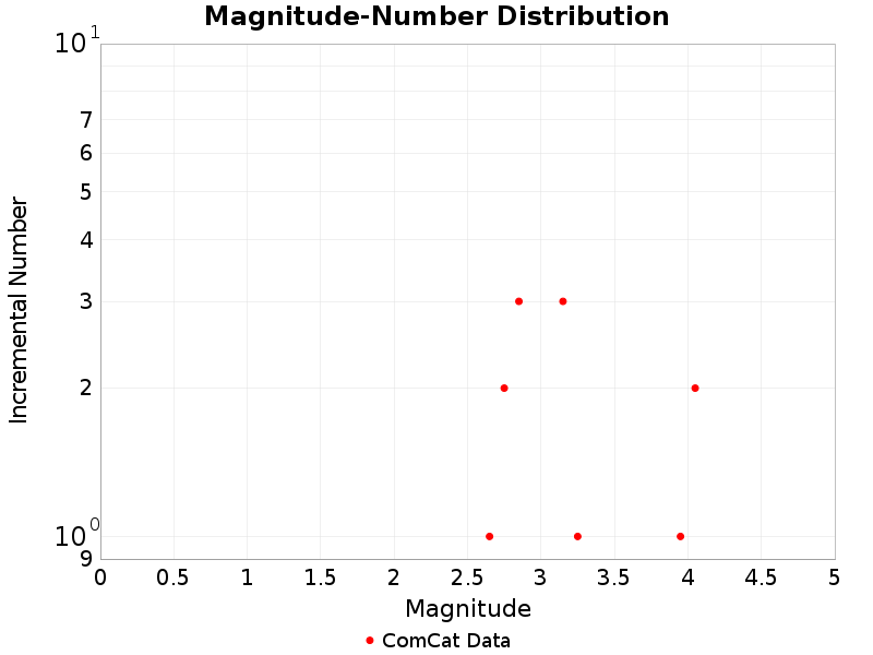 These plot shows the magnitude-number distribution of the aftershock sequence thus far. The left plot gives an incremental distribution (the count in each magnitude bin), and the right plot a cumulative distribution (the count in or above each magnitude bin).