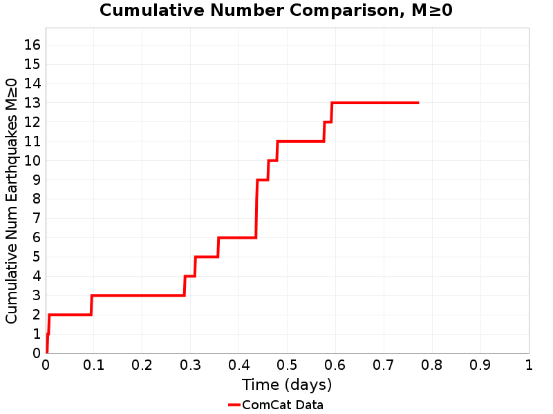 This plot shows the cumulative number of M≥0 aftershocks as a function of time since the mainshock.