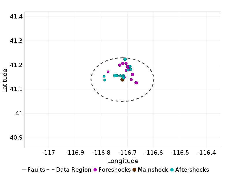 Map view of the aftershock sequence, plotted as cyan circles. The mainshock and foreshocks are plotted below in brown and magenta circles respectively, but may be obscured by aftershocks. Nearby UCERF3 fault traces are plotted in gray lines, and the region used to fetch aftershock data in a dashed dark gray line.